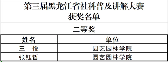 近日,黑龙江省社会科学界联合会公布了第三届黑龙江省社科普及讲解大赛获奖名单。我院学子王悦、张钰哲在本次大赛中表现优异荣获二等奖。