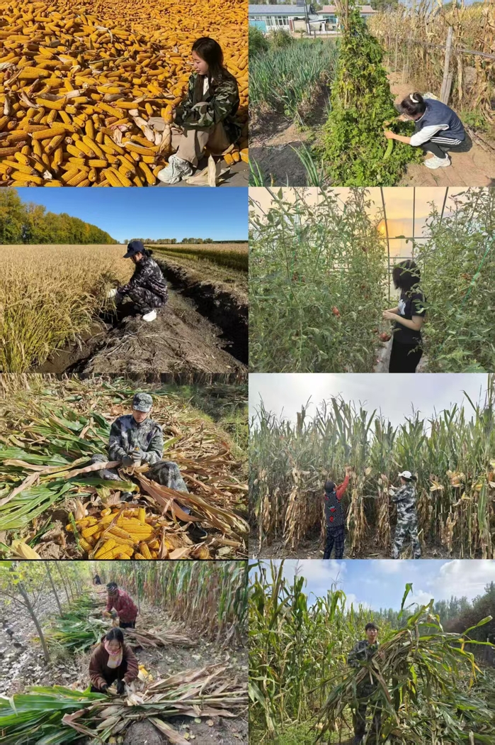 时序金秋,万物盈仓。同学们循着农时走进田间地头。他们中,有人弯腰穿梭玉米地,镰刀挥舞间利落割下饱满果穗;有人投身菜畦间,将青瓜、番茄等收入筐中,汗水浸透衣衫仍脚步不停;还有人坐在在田埂旁,细心筛选籽粒、协助翻晒作物,用耐心细致的操作守护每一粒粮食。青春身影与金黄田野相映,绘就了一幅生动的秋日劳作图景。