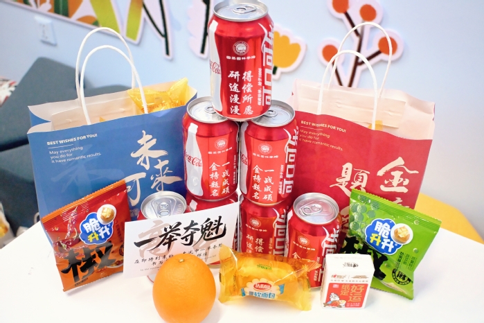 学院此次准备的礼物清单中,每一份物品都蕴含巧思:脆脆升薯条以“步步高升”的谐音传递学业攀升的祝愿;软糯的小面包化身“包上岸”的吉祥物,寄托一战成硕的期待;旺仔牛奶糖以“运气旺旺”为学子注入好运能量;金黄饱满的橙子象征“心想事橙”的美好愿景;印有“纸定高分”的手帕纸,用幽默方式化解考前紧张;定制版可乐罐身镌刻“金榜题名”“一研为定”等祝福语,成为独一无二的纪念品。