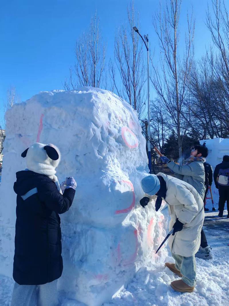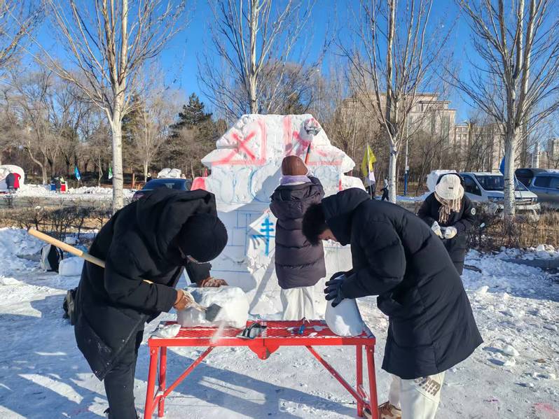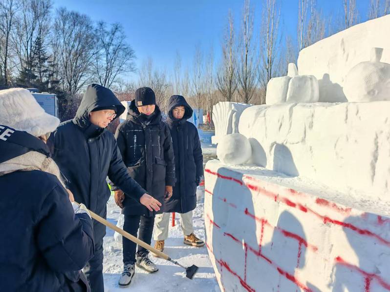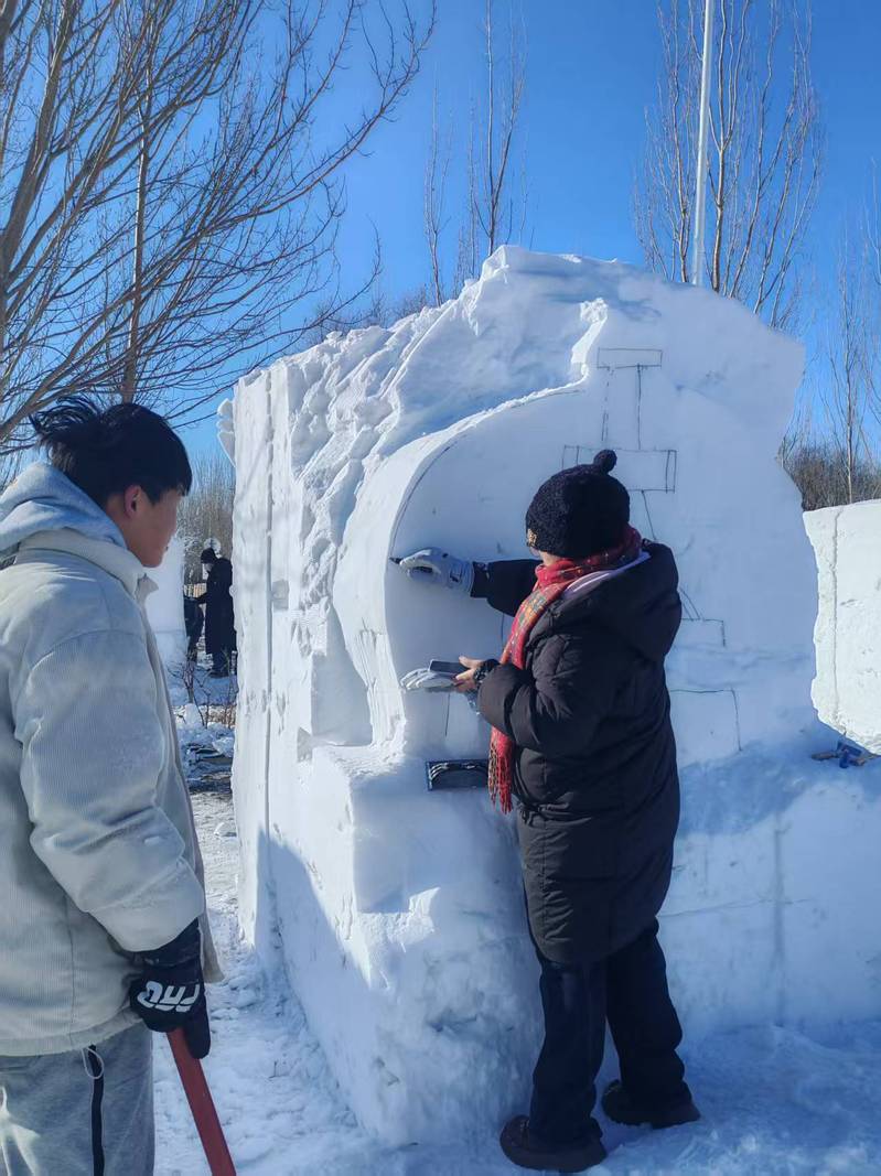 比赛期间,天寒地冻的赛场俨然成为创意迸发的热土。我院参赛学子充分发挥专业优势,从构思草图到雕琢雪块,每一个环节都精益求精,他们分工明确、默契配合。参赛队员不畏严寒、挥刀弄铲,每天在户外工作多个小时,创造出了一个个形态各异、立意深刻、形式新颖的雪雕艺术作品,充分展现了扎实的雕刻功力和艺术创作能力。