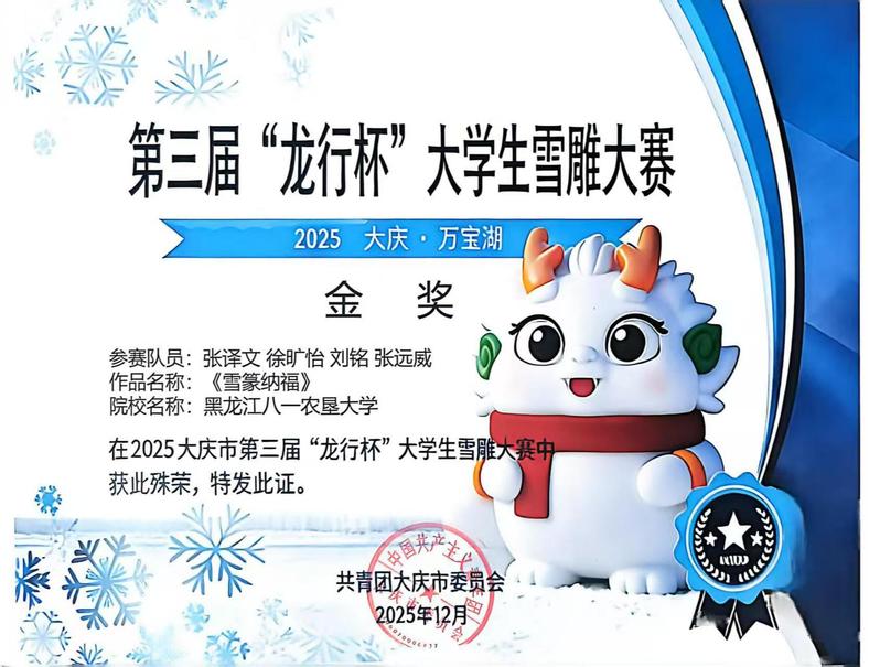 近日,大庆市第三届“龙行杯”大学生雪雕大赛隆重举行。本次赛事由共青团大庆市委员会主办,大庆市龙舟协会、大庆市龙行体育文化传媒有限公司联合承办,吸引全市五所高校的雪雕创作团队同台竞技,共赴冰雪艺术之约。经过数天的激烈角逐与专业评审,园艺园林学院共获金奖2项、银奖4项、铜奖8项,创历史新高。